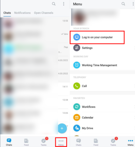 Αφού ανοίξουμε τη mobile εφαρμογή πατάμε στις 3 τελείες δεξιά και έπειτα "Login on your computer"