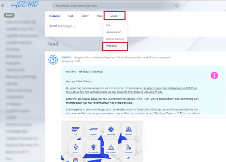 Στο menu σελίδας, επιλέγουμε "MORE" και έπειτα στο drop down menu την επιλογή "WORKFLOW"